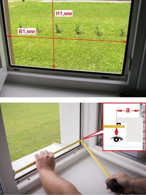 Замер светового проема. Откройте створку окна и измерьте световой проем (высота H1, ширина B1) от резинки до резинки с точностью до мм. Проверьте размер "а" и прибавьте напуск сетки на раму.